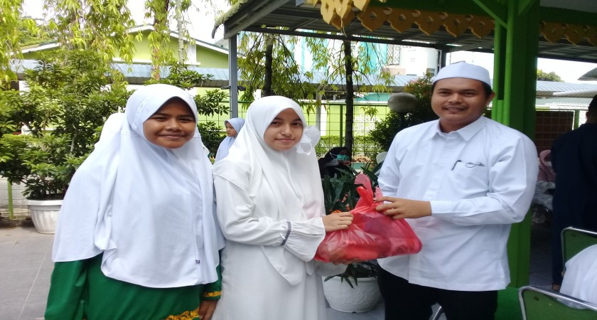 acara selanjutnya yaitu pembagian paket ramadhan berbagi yang di bagikan langsung oleh anggota osis kepada seluruh majelis guru dan karyawan smp babussalam pekanbaru.